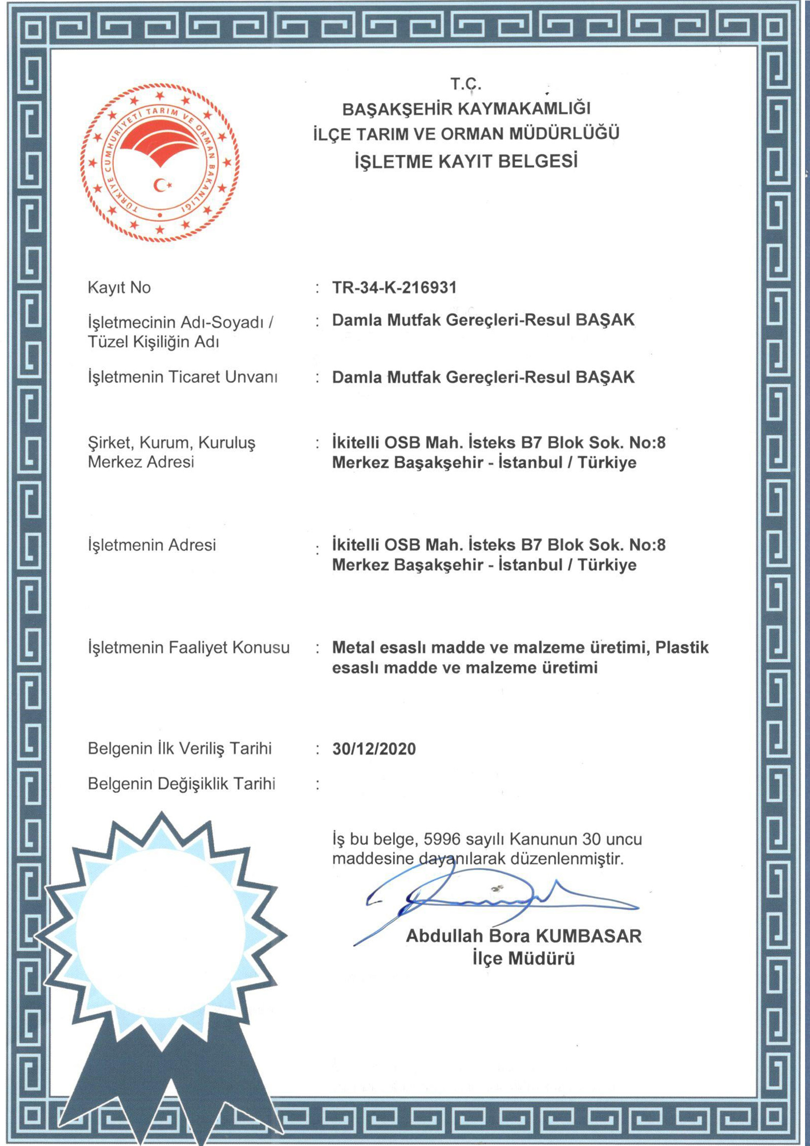 İşletme Kayıt Belgesi