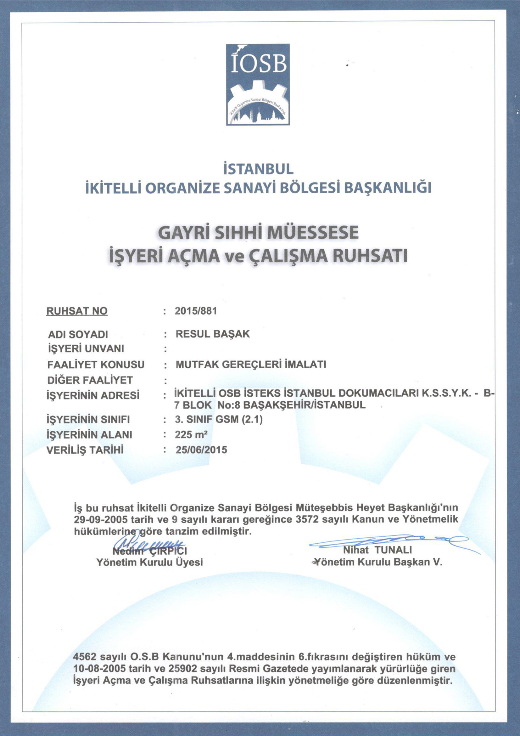 İşyeri Açma ve Çalıştırma Ruhsatı